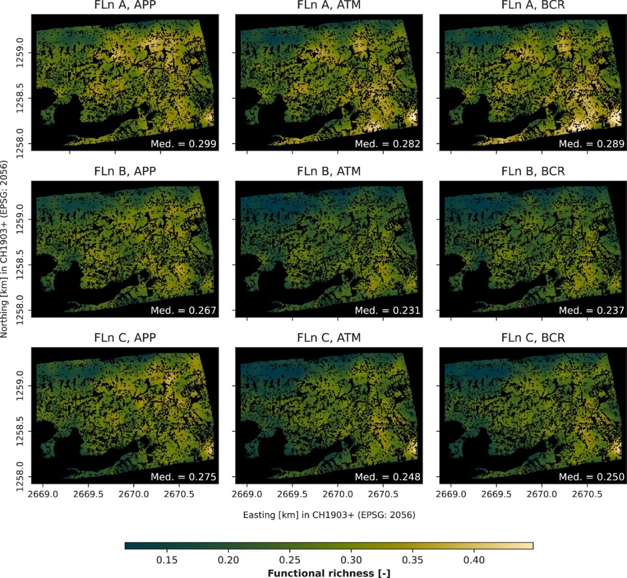 To test how robust functional richness estimates are, the researchers collected data over the Lägeren forest near Zürich by plane. They flew three consecutive flight lines within minutes of each other but from different directions. In doing so, they gathered data under slightly different observation conditions. The datasets were then processed in three different ways: first without any corrections (APP), then with atmospheric and topographic corrections (ATM), and finally with additional anisotropy corrections (BCR).